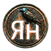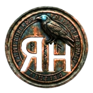 Logotipo del autor Rubén H. Ernand de estilo grimdark. Un cuervo cubierto de sangre está posado sobre las iniciales metálicas "RH", con el nombre completo debajo, rodeado de remolinos oscuros y rojizos.