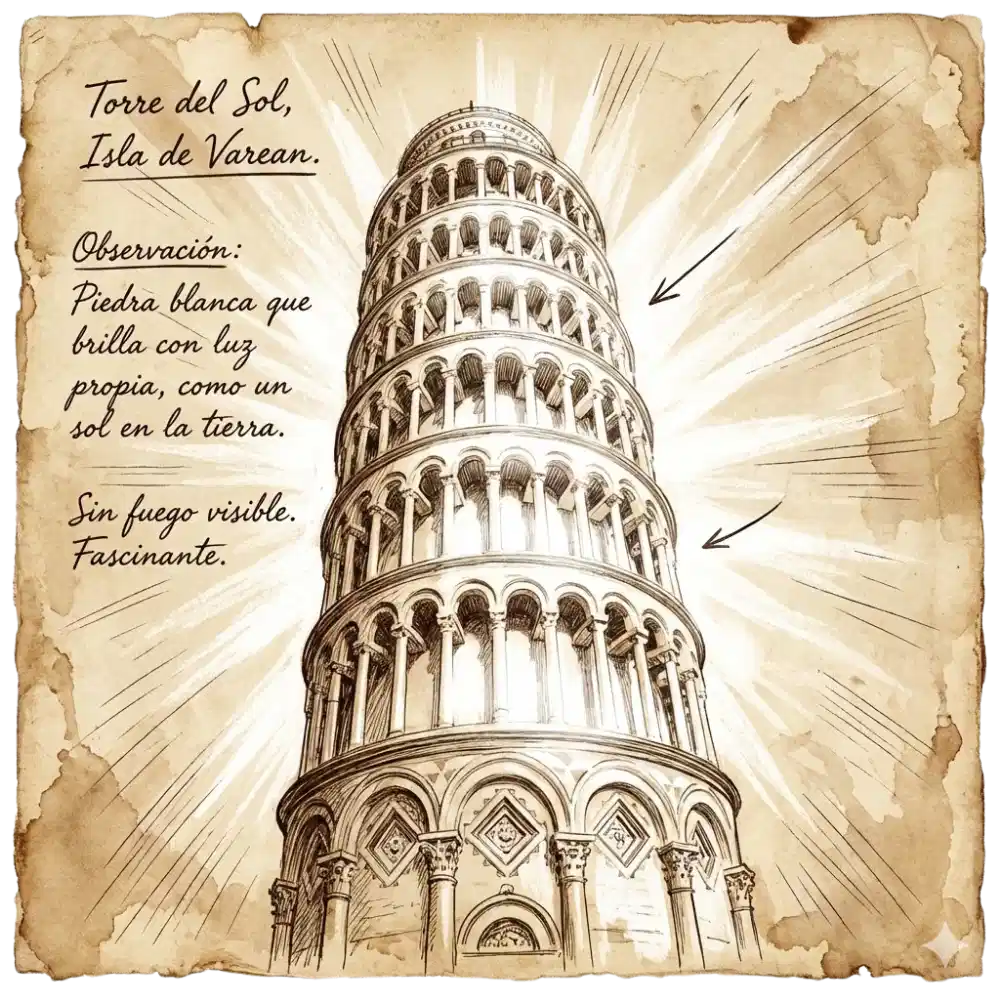 He alcanzado la isla de Varean. Al ver la Torre del Sol, comprendes que es una vista impresionante e inolvidable; algo que se queda grabado en el alma de quien tiene la suerte de contemplarla. Lo que más impacta es su piedra blanca: parece tener luz propia, absorbiendo los rayos del sol durante el día para irradiarlos después. Incluso cuando la noche cae sobre el Mar del Albor, la torre no se apaga; su resplandor mengua hasta convertirse en un suave fulgor que sigue guiando a los perdidos. Es fácil creer las leyendas que dicen que esta luz protegió a la isla mientras el resto del mundo se tambaleaba durante las Siete Ruinas.»